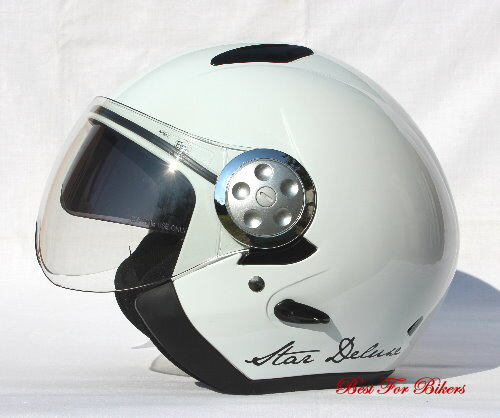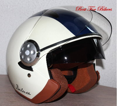 Formschöner und praktischer Jet Helm aus Polycarbonat. Mit einem klaren, kratzfesten Visier und einen zusätzlichen Sonnenvisier ist immer gut Sicht garantiert. Das Sonnenvisier wird durch einen Hebel außen am Helm hoch- und runtergeklappt. Das Sonnenvisier kann also auch während der Fahrt mit Handschuhen bedient werden. Das Innenfutter ist herausnehmbar und waschbar. Für einen allzeit “kühlen Kopf” sorgen die beiden verschließbaren Lufteinlässe oben am Helm und die beiden Luftauslässe im Nackenbereich. Der Helm hat einen Ratschenverschluss.